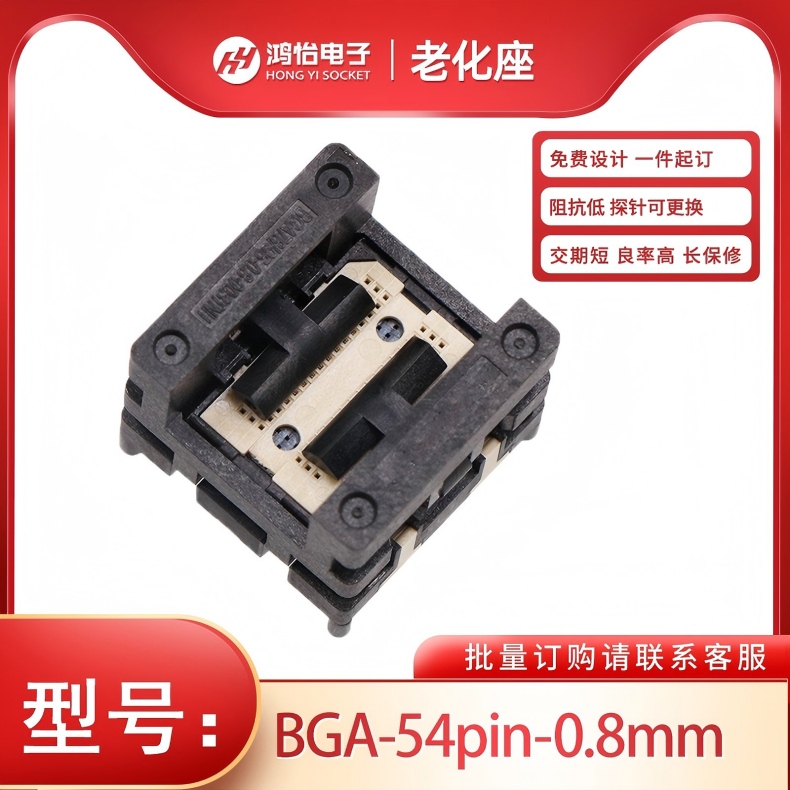 鸿怡电子测试座socket商城提供BGA54pin-0.8mm尺寸:8mm×8mm下压老化测试座